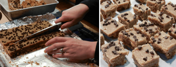Once the penuche had set up for about an hour, I sprinkled chocolate chips over the top. I think I should have done it a little sooner, because the top was already firm enough that the chips didn’t really stick. And next time I’ll be more generous with the chips as well. Next time, wall-to-wall chips!