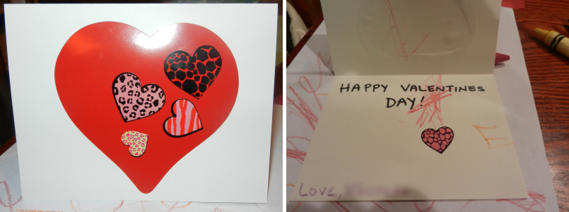 I glued big red hearts onto some blank cards that I had on hand, and then let Kiddo go to town with the heart stickers that I’d gotten on my way home.A couple ended up on his father’s card as well. Then I wrote a greeting on the inside and Kiddo “signed” the cards with a scribble or two.