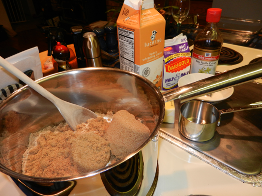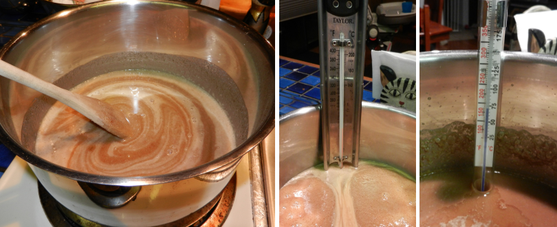 And now, get to cookin’! Combine the ingredients (other than the vanilla and butter which go in later), cook without stirring up to 238 F, then remove from heat, float the butter and vanilla on top, and let it cool — again, without stirring — to 110.