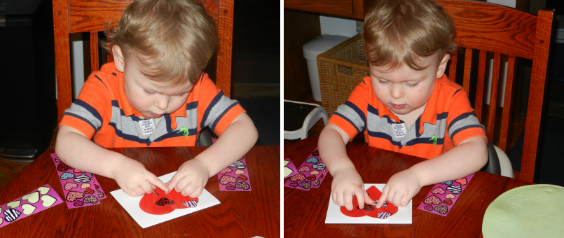 He had a little trouble getting the stickers off the sheet, so his dad and I took turns helping out.