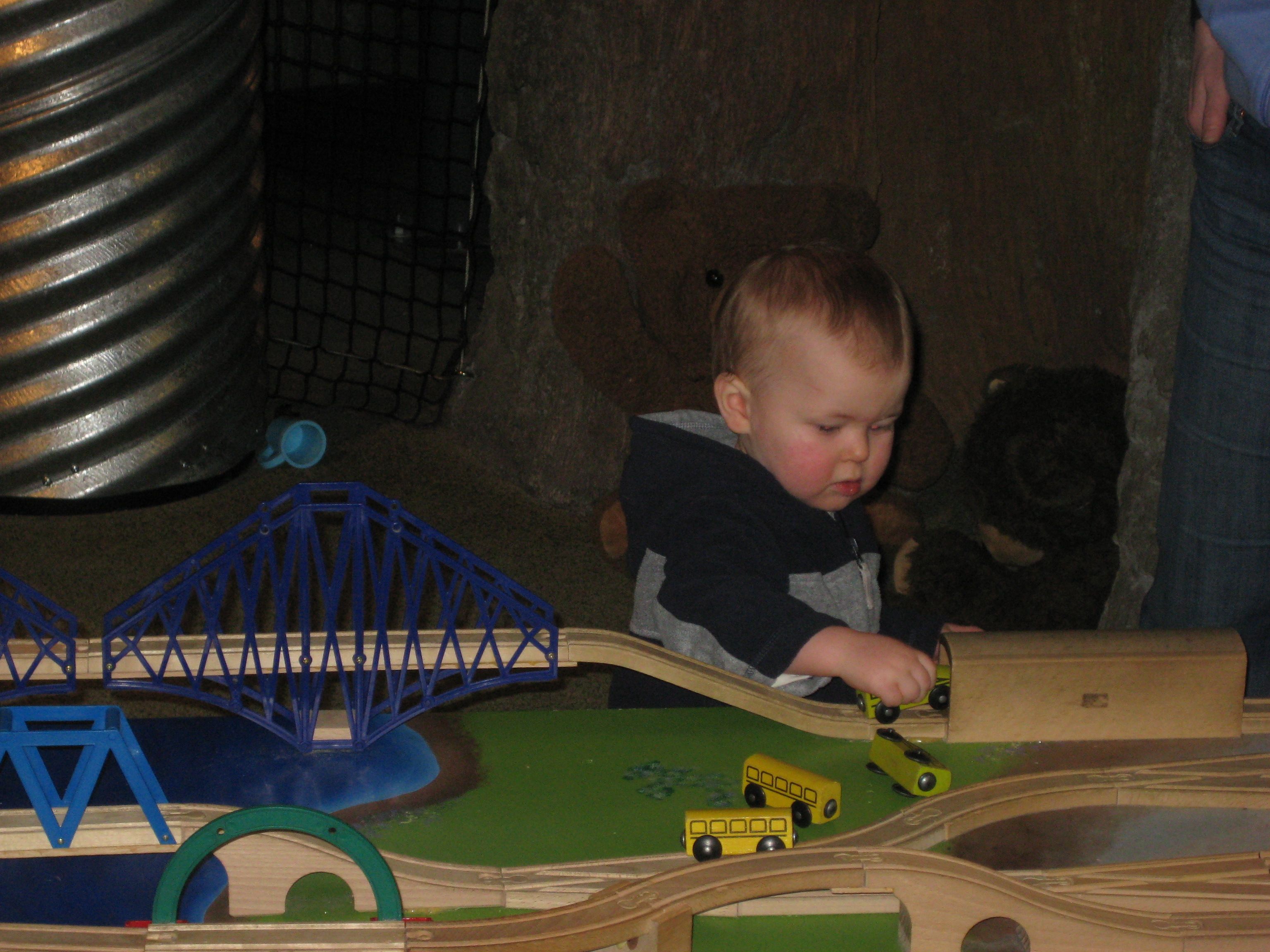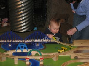 There’s a central play area called the Backyard that’s designed for children ages 0 to 3.  They have a big train table set up…