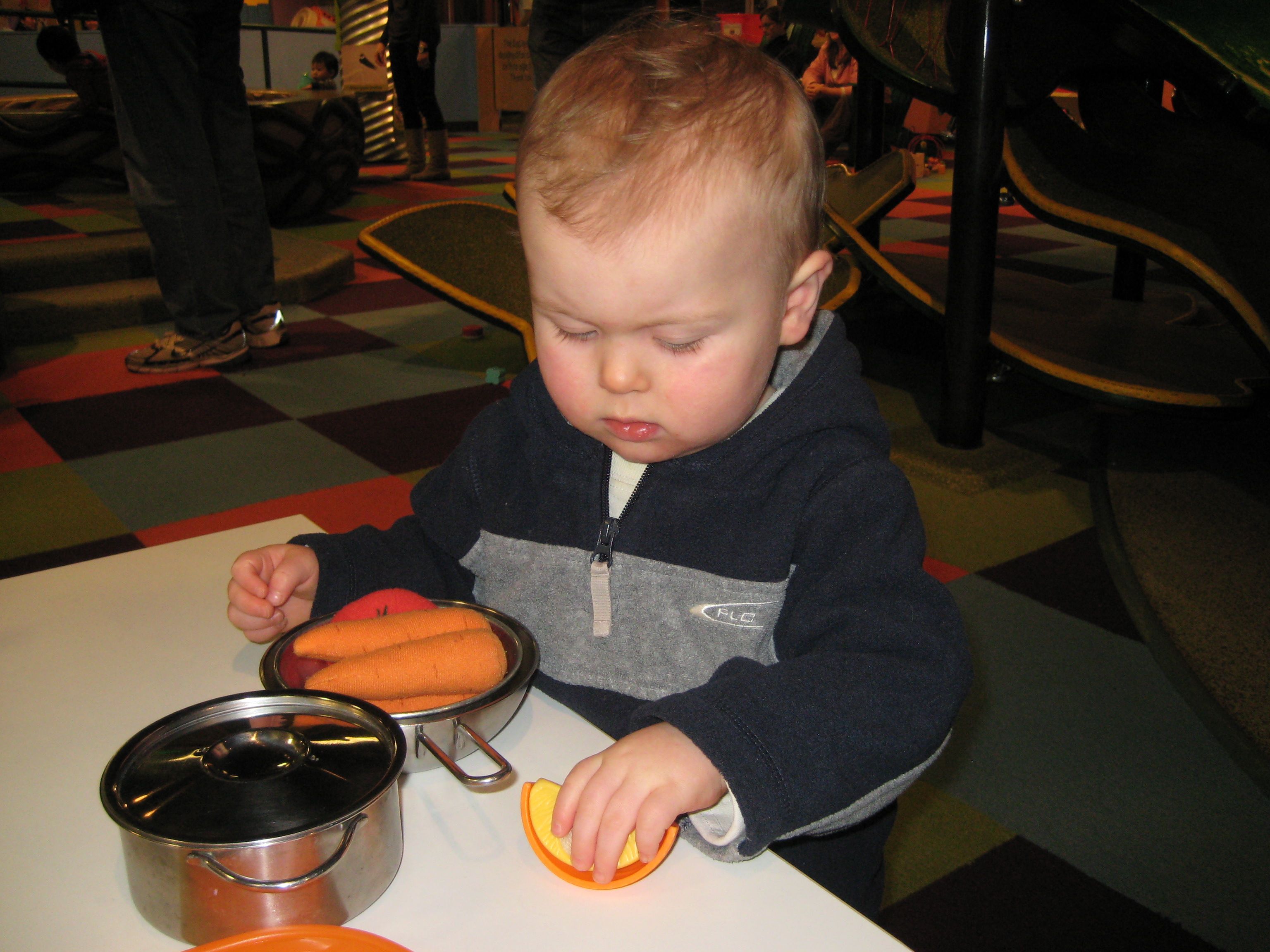 Near the train table is a miniature kitchen.  Naturally, Kiddo gravitated toward the orange foods and dishes.